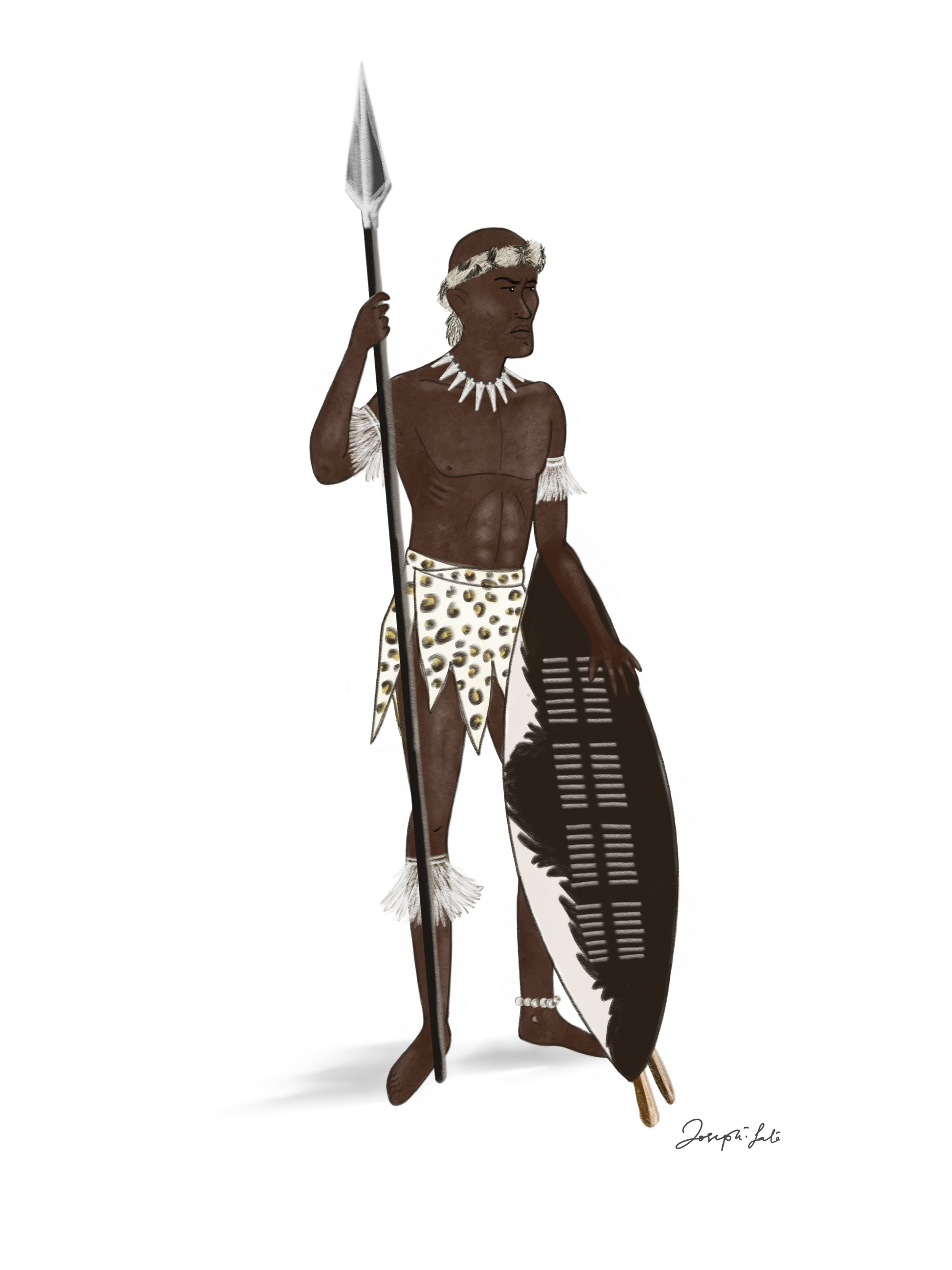 Created as part of the "War and Fashion" series, popular among Joseph Tate's audience, this piece brings to life the attire worn by soldiers in the epic battles of Rorke's Drift during the Anglo-Zulu Wars. In this depiction, a Zulu soldier stands firm in his battle arrire.